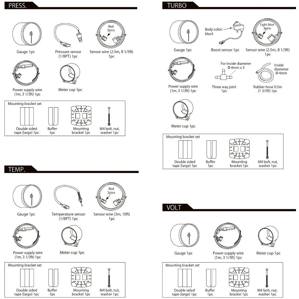 Comes with a gauge, sensor harness, power supply harness, and a gauge mounting kit. A gauge mounting kit includes a gauge mounting cup, bolts, double-sided tape, and a gauge mounting bracket. In addition, a turbo boost gauge comes with a hose and a joint for the sensor.