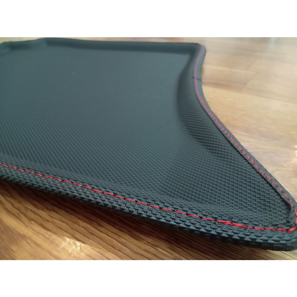 These 3D Molded rubber floor mats were specifically designed with a precise fit for your Jimny. Made of heavy-duty rubber, the mats completely line the Jimny's interior foot-well giving absolute protection. The back side is made of non-slip material, so you don't have to worry about the mat slipping. Because it is a split type, it is easy to remove and clean. These floor mats don't have a rubber odor like tires. Black mats with red stitching around the edges with the TANIGUCHI logo.